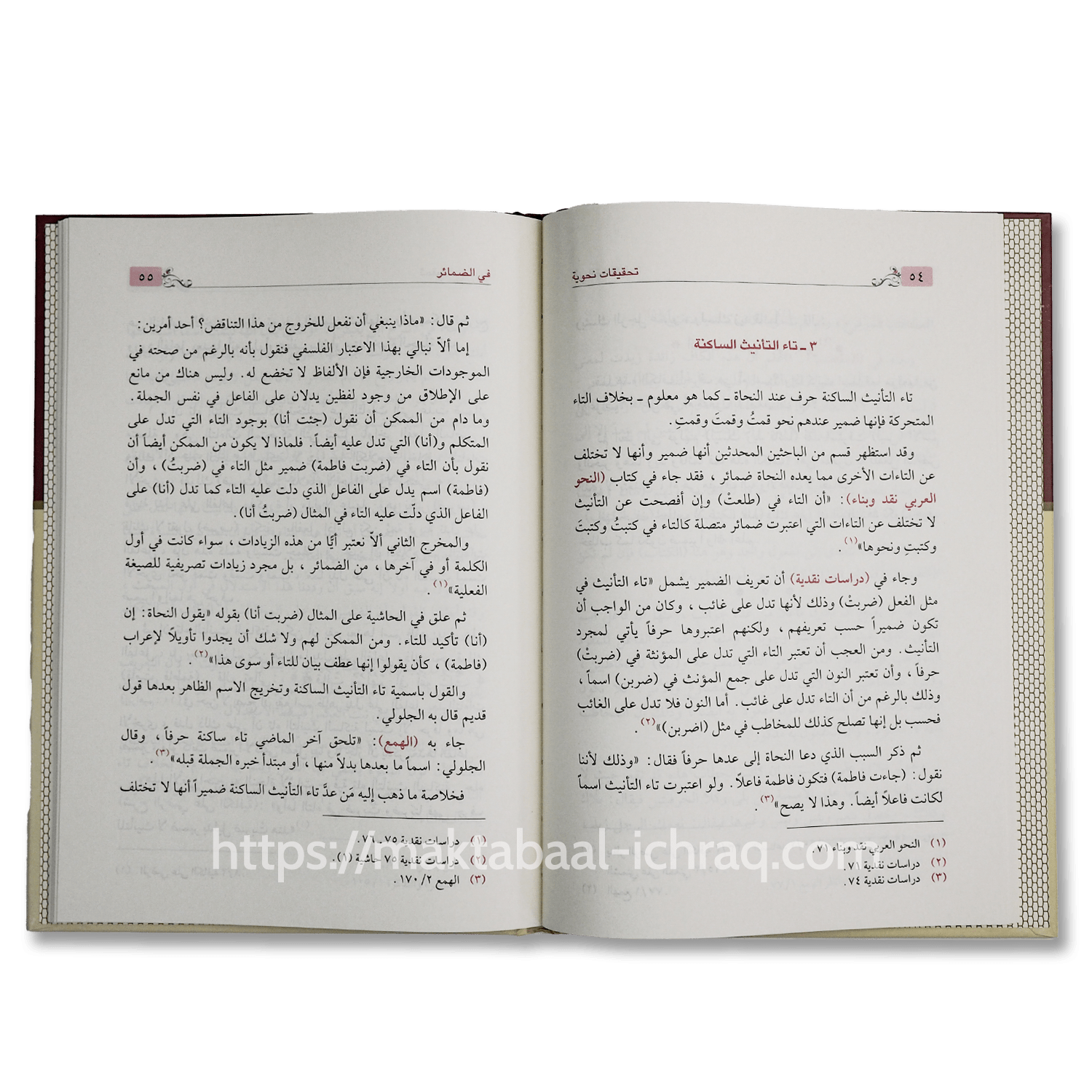 من بين المسائل التي يسلّط عليها الضوء، عدُّ تاء التأنيث الساكنة حرفًا، بينما يرى المؤلف أن الصواب اعتبارها ضميرًا، لا تختلف في ذلك عن التاء المتحركة، فكلاهما يقوم بالدلالة نفسها، ويأخذ موقعًا نحويًا لا يتغير. كما يعالج مسألة حروف المضارعة، ويخالف الرأي الشائع الذي ينفي عنها صفة الضمائر، مؤكداً أنها تؤدي وظيفةً ضميرية لا تقل عن سائر الضمائر في التراكيب. وفي مواضع أخرى، يردّ على ما نُسب خطأً إلى جمهور النحاة من منع تقديم الفاعل على الفعل، مبيّنًا أن هذه النسبة لم تُفهم على وجهها الصحيح